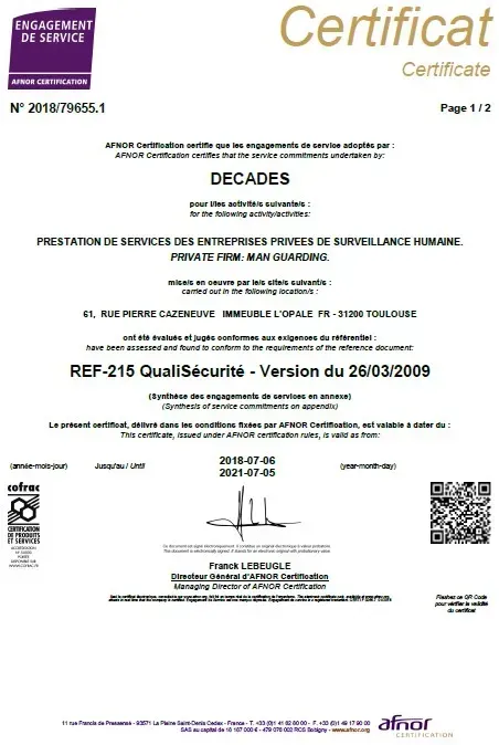 DECADES Sécurité Privée est certifiée QUALISÉCURITE Réf. 215 par AFNOR Certification. Cette distinction atteste du respect strict des engagements de service, de la conformité réglementaire et de la qualité des prestations.